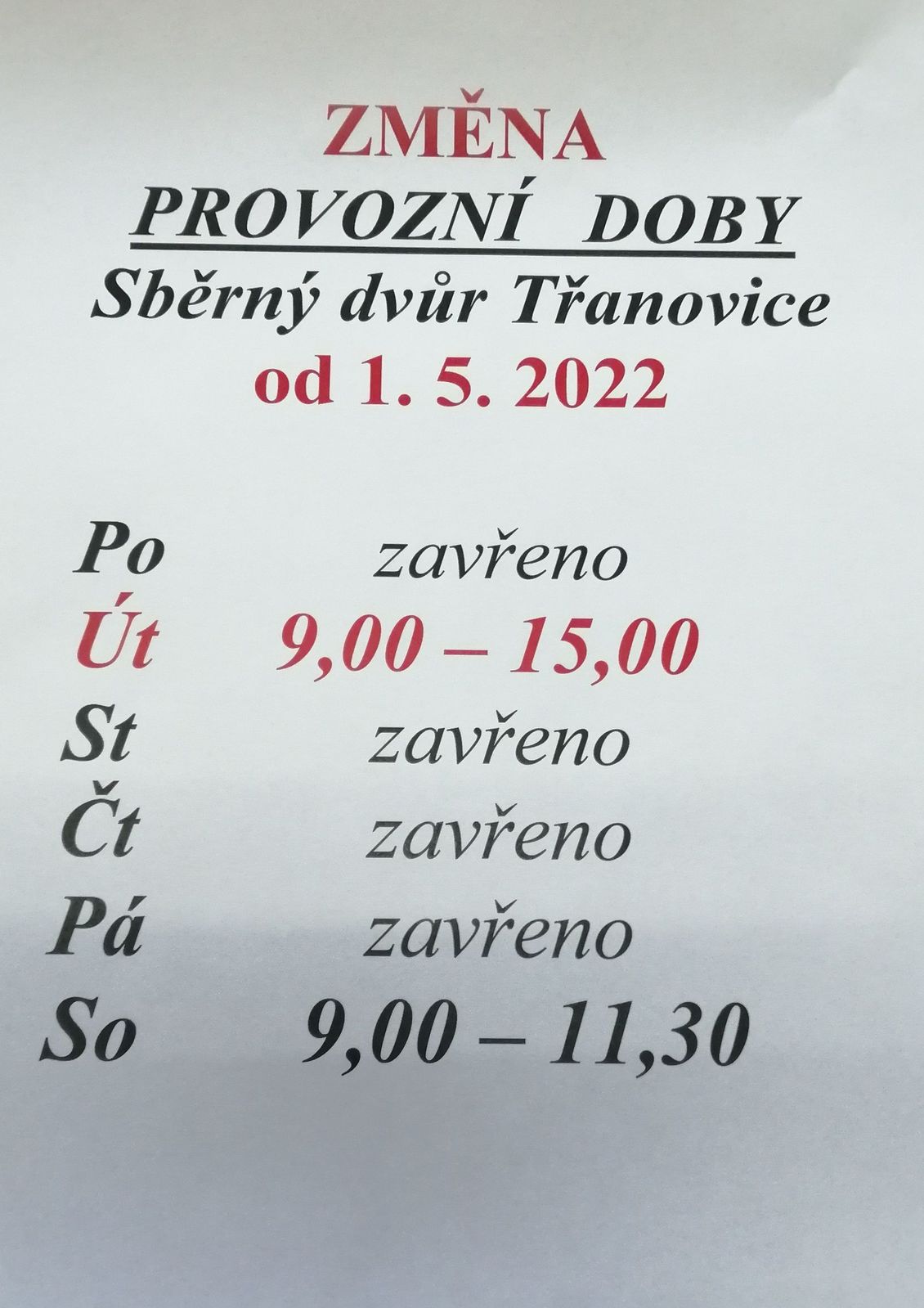 Úvod > Život v obci > Aktuality > Změna provozní doby na Sběrném dvoře v Třanovicích od 1.05.2022
